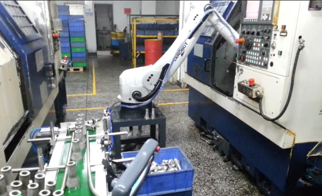 (数控机床+六轴机械手)自动上下料应用、主要应数控加工中心,实现加工件的自动上下料,替代人工的重复劳作。